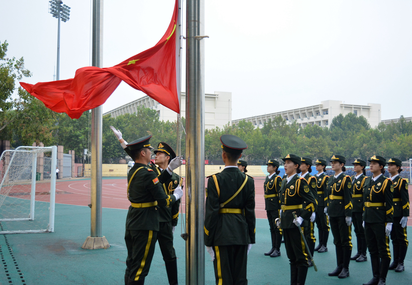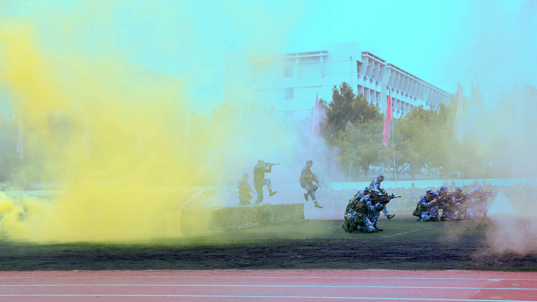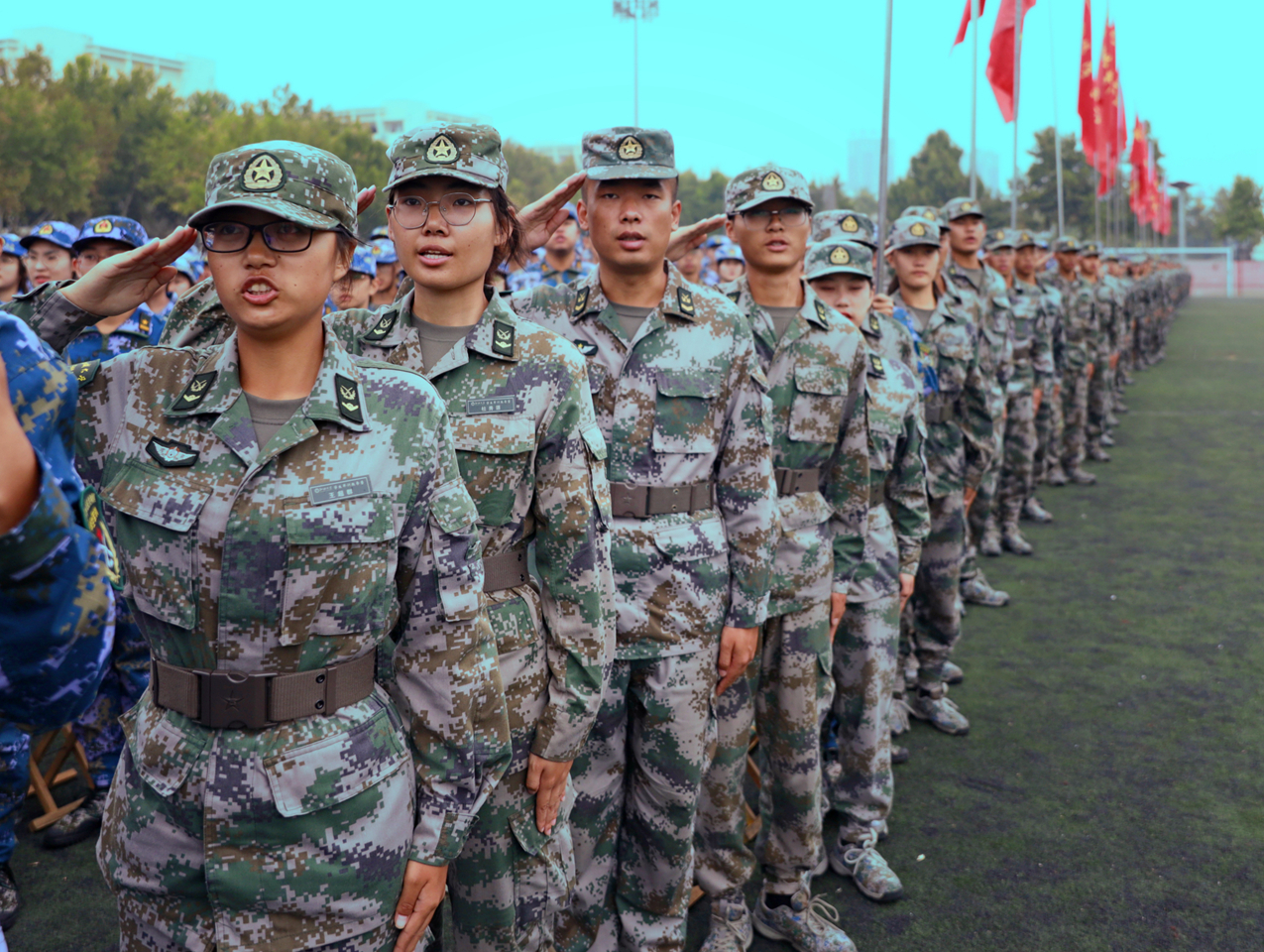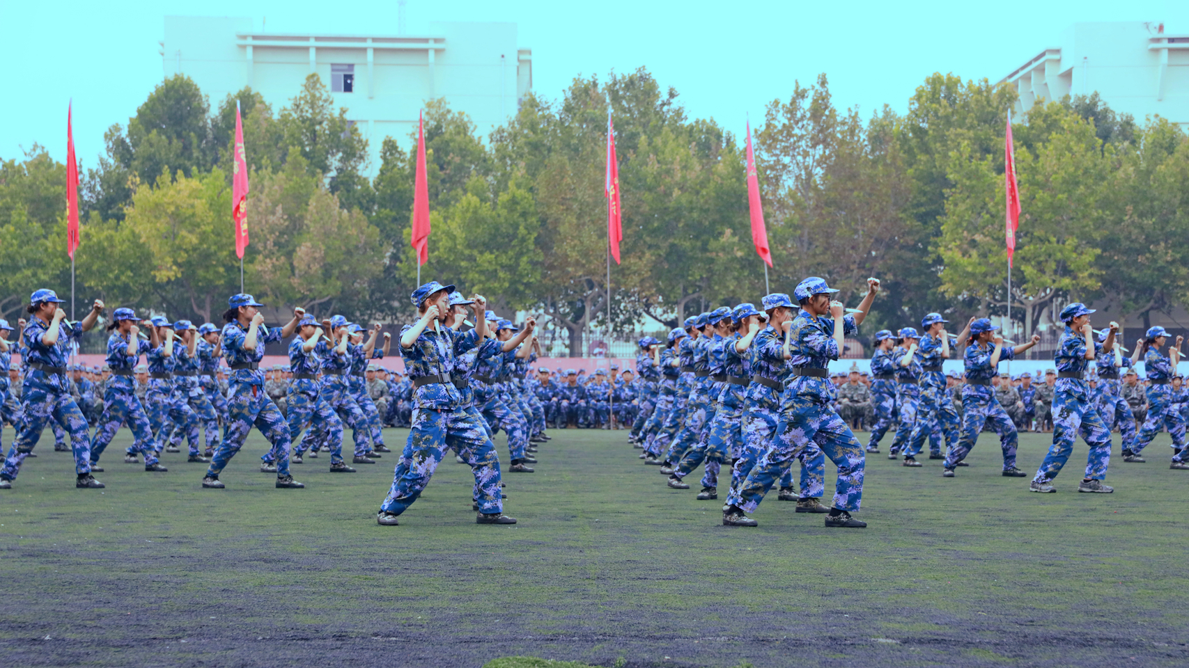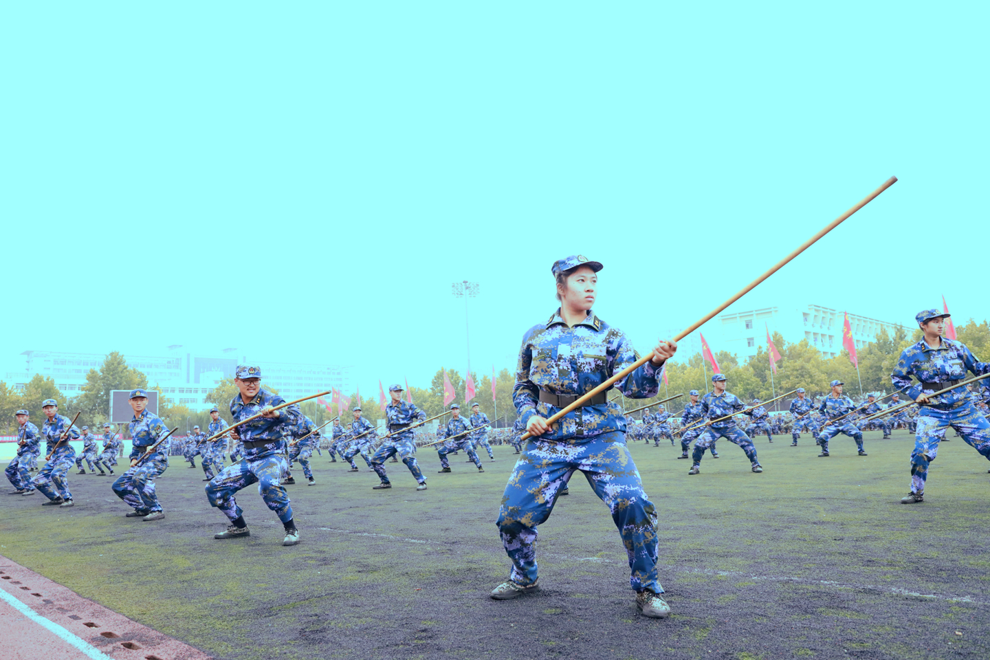 9月18日上午,我校在西校區南田徑場舉行2021級學生軍訓匯演。匯演中,新生們依次進行了隊列展示、應急棍術、軍體拳、匕首操、戰術演練等訓練科目表演。他們整齊的步伐、有力的動作、響亮的口號,彰顯了聊大學子活力四射、頑強拼搏的精神風貌,贏得全場觀眾陣陣掌聲。