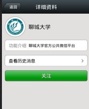 聊城大學微信公眾賬號于2013年6月注冊認證并開始使用。宗旨是服務廣大的聊大師生、校友以及關心支持聊大的各界領導和朋友。微信賬號是lcdxwx,二維碼如圖一。