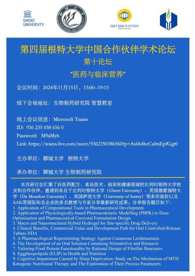 第四屆根特大學(xué)中國(guó)合作伙伴學(xué)術(shù)論壇——第十論壇:醫(yī)藥與臨床營(yíng)養(yǎng)