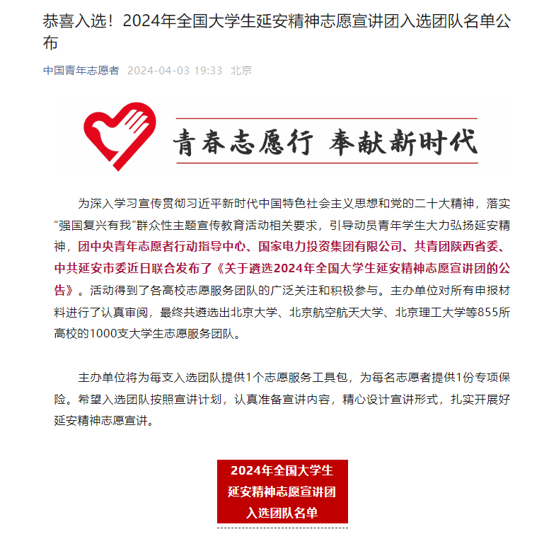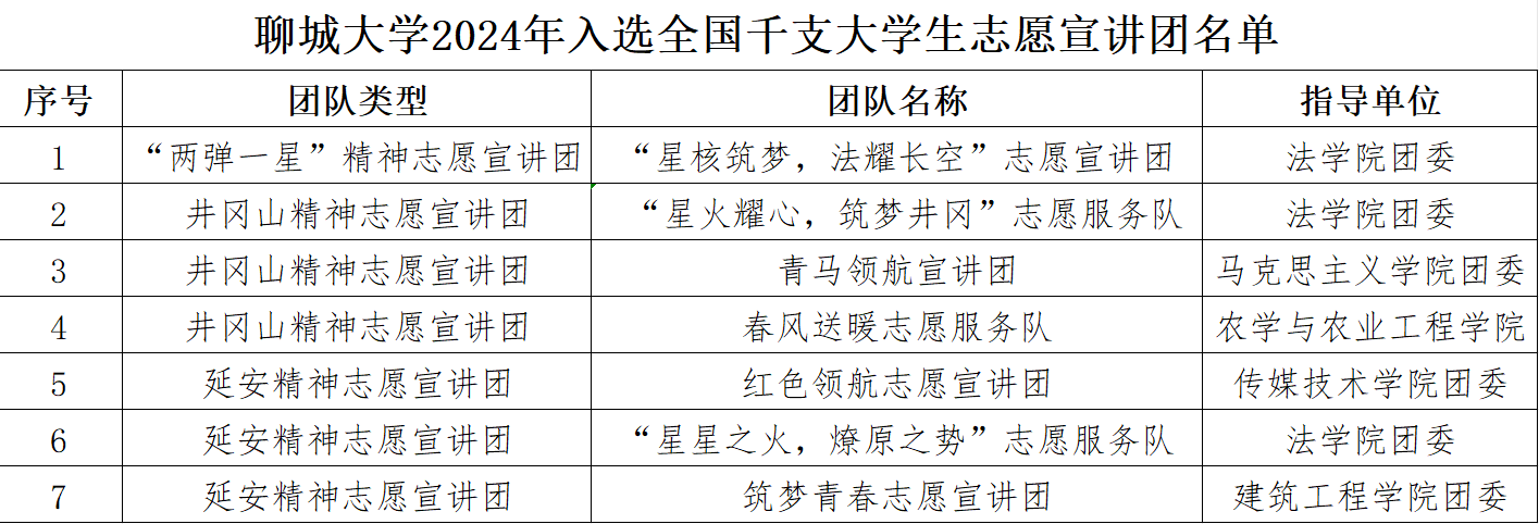 近日,團中央青年志愿者行動指導中心發布“兩彈一星”精神志愿宣講團、井岡山精神志愿宣講團、延安精神志愿宣講團等三項全國千支大學生志愿宣講團入選團隊名單,聊城大學七支團隊成功入選。