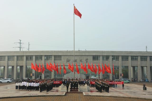 上午7時,英姿颯爽的國旗護衛隊邁著整齊劃一的步伐,以昂揚的姿態護送鮮艷的五星紅旗走向升旗臺,伴隨著雄壯激昂的《義勇軍進行曲》,鮮艷的五星紅旗緩緩升起,全體師生面向國旗行注目禮。
