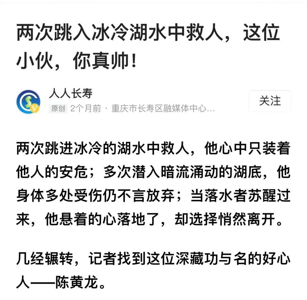 事態(tài)緊急,陳黃龍換了一口氣,屏住呼吸,反復(fù)潛入水中尋人。因長(zhǎng)時(shí)間泡在冰冷刺骨的水里,深諳水性的陳黃龍大腿也開始抽筋,體力嚴(yán)重不支,他掙扎著往岸邊靠近。