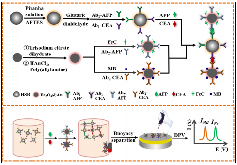 本文開發了一種磁浮協同介導免固定電化學免疫傳感平臺,能實現雙目標腫瘤標志物的同時精準檢測。該研究以臨床腫瘤標志物癌胚抗原(CEA)和甲胎蛋白(AFP)為腫瘤標志物模型分子,以浮力介導雙目標識別耦合磁性驅動電信號報告,以溶液相替代電極界面特異性免疫識別反應,可實現免外力生物識別分離目標,有效提高生物反應速率與生物識別效率,大大降低假陽性或假陰性概率,提高診斷準確率。該策略不僅提供了一種全新的腫瘤生物標志物雙目標定量方法,而且有望為免固定電化學傳感在即時檢測領域的應用提供新的研究思路與研究視角。
