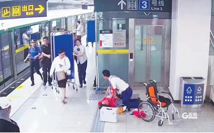 7月14日,在青島地鐵錯埠嶺站的站臺上,一名乘客因突發(fā)疾病心臟驟停、倒地不起。值班站長劉吉祥接到呼叫后立即趕到現(xiàn)場,一邊通知車站控制室撥打“120”,一邊對乘客實施AED胸外按壓。一分鐘后,乘客口中發(fā)出微弱的嘆息,并緩慢地睜開了雙眼,恢復意識。醫(yī)護人員隨后到達現(xiàn)場,檢查確認乘客已恢復心跳呼吸后送醫(yī)治療。