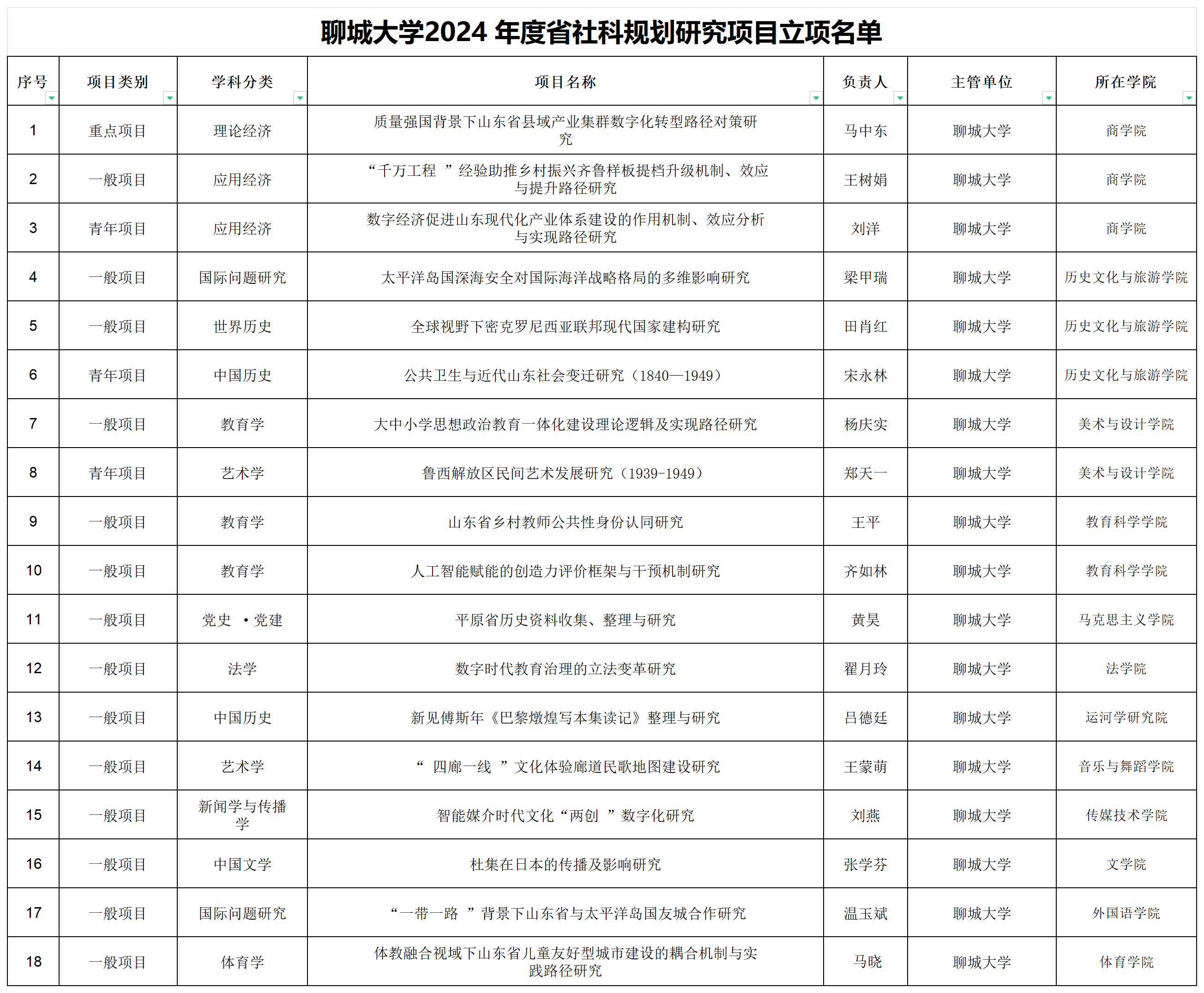 近日,省委宣傳部發(fā)布了2024年度山東省社科規(guī)劃研究項(xiàng)目立項(xiàng)名單,聊城大學(xué)獲批18項(xiàng)。其中,重點(diǎn)項(xiàng)目1項(xiàng),一般項(xiàng)目14項(xiàng),青年項(xiàng)目3項(xiàng)。