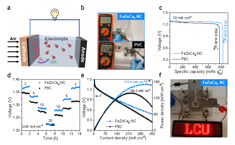 開發(fā)利用清潔能源技術(shù)是實(shí)現(xiàn)“碳達(dá)峰、碳中和”國家戰(zhàn)略目標(biāo)的重要舉措。鋅-空氣電池由于高能量密度,成本低,環(huán)境友好的特點(diǎn)受到了廣泛關(guān)注。李海波及其團(tuán)隊(duì)通過甲酰胺溶劑熱法合成催化劑前驅(qū)體,隨后在惰性氣體下熱處理實(shí)現(xiàn)了FeZnCe在碳基體上的高度分散。球差電鏡、同步輻射表征及電化學(xué)測試表明,Ce和Zn原子對金屬活性位點(diǎn)電子結(jié)構(gòu)具有優(yōu)化輔助效應(yīng),可以明顯提高Fe原子位點(diǎn)的氧還原反應(yīng)動力學(xué)。將該材料組裝成鋅-空氣電池進(jìn)行性能測試,發(fā)現(xiàn)其在功率密度、恒電流/變電流放電電壓等電池性能均優(yōu)于商業(yè)Pt/C催化劑,展現(xiàn)出了良好的應(yīng)用前景。