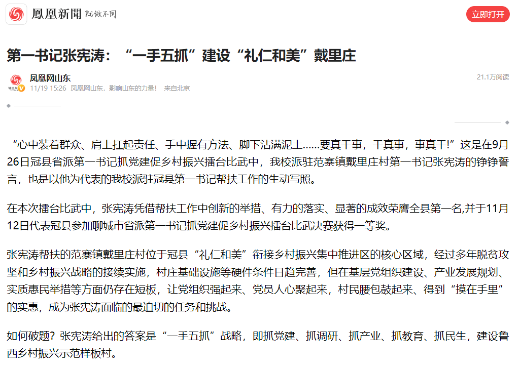 【編者按】11月19日,鳳凰網站平臺以《第一書記張憲濤:“一手五抓”建設“禮仁和美”戴里莊》為題,報道我校后勤管理服務中心副主任張憲濤擔任冠縣范寨鎮戴里莊村第一書記,抓黨建、抓調研、抓產業、抓教育、抓民生,協調爭取幫扶資金共計近2000萬元,建設魯西鄉村振興示范樣板村的工作情況。