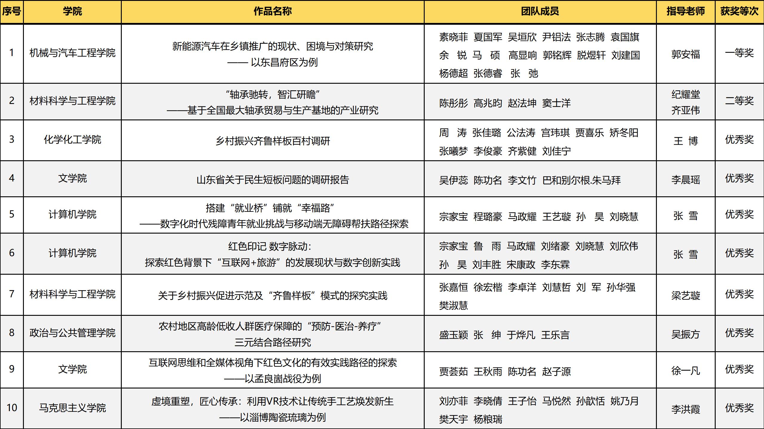 本次征集評選活動聚焦中國式現代化山東實踐,圍繞全面深化改革、民主法治、基層治理、鄉村文化振興、民生保障、科技自立自強、生態環境保護、公眾人文社科素養等重點領域,面向全省高校師生征集2024年大學生暑期社會實踐優秀成果。經組織申報、資格審查和專家組評審,全省評選大學生優秀實踐調研成果一等獎10項、二等獎15項、三等獎25項、優秀獎50項。