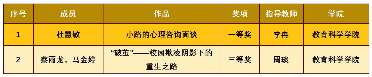 杜慧敏同學(xué)的心理咨詢/心理治療面談組作品《小路的心理咨詢面談》經(jīng)過層層選拔,最終脫穎而出,代表學(xué)校參加了全國總決賽。在決賽中,杜慧敏同學(xué)展現(xiàn)了扎實的專業(yè)知識和出色的實踐能力,憑借對來訪者問題的精準把握和個案概念化的能力,贏得評委的高度評價,最終榮獲大賽一等獎。蔡雨龍和馬金婷同學(xué)組成的團隊在應(yīng)用心理案例比賽中同樣表現(xiàn)優(yōu)異,展現(xiàn)了其在應(yīng)用心理學(xué)領(lǐng)域的深刻理解和協(xié)作能力,最終榮獲全國三等獎。