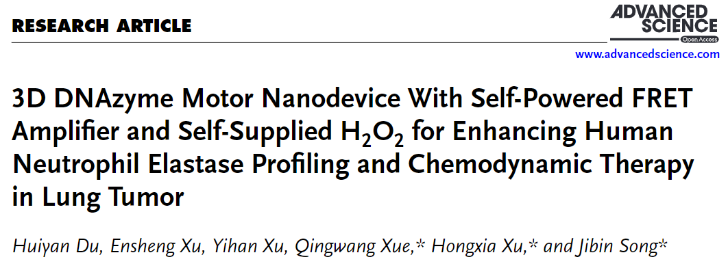 近日,我校化學化工學院薛慶旺教授課題組開發了集成FRET(熒光共振能量轉移)成像和化學動力學療法(CDT)的診斷治療納米系統以準確診斷和有效治療肺部腫瘤,相關研究成果以《具有自驅動FRET放大器和自供給過氧化氫的3D DNAzyme馬達納米裝置用于增強肺癌中的人中性粒細胞彈性蛋白酶分析和化學動力學治療 》(3D DNAzyme Motor Nanodevice With Self‐Powered FRET Amplifier and Self‐Supplied H 2 O 2 for Enhancing Human Neutrophil Elastase Profiling and Chemodynamic Therapy in Lung Tumor)(DOI: 10.1002/advs.202406599)為題在線發表于國際頂級學術期刊《尖端科學》(Advanced Science)(中科院1區,IF="14.3)。該期刊是跨學科的高影響力期刊,專注于材料科學、化學、生物科學和工程領域的創新研究。