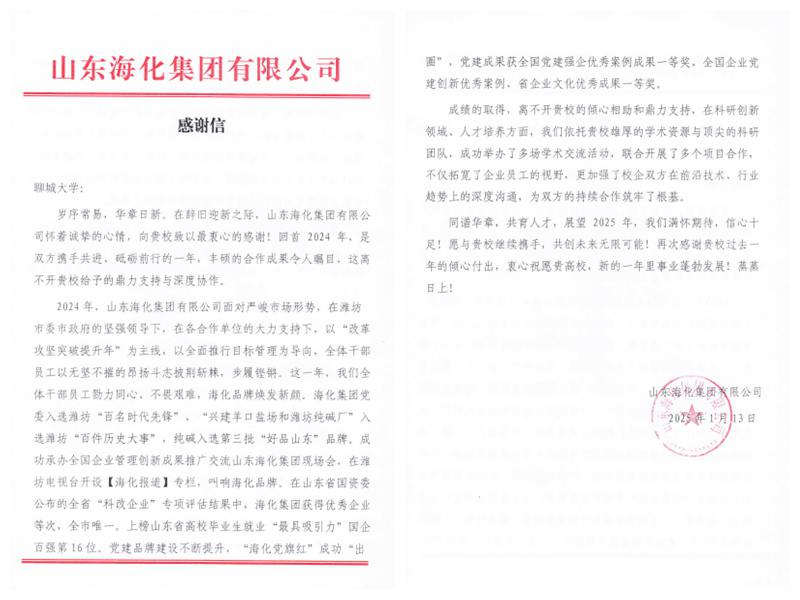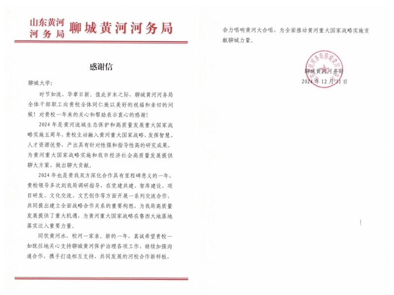 近日,聊城大學分別收到了來自聊城黃河河務局、山東海化集團的兩封感謝信,感謝聊城大學在2024年為黃河重大國家戰略實施和經濟社會發展提供聊大方案,做出聊大貢獻。