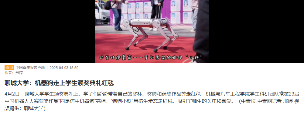 【中國青年報客戶端】報道聊城大學:機器狗走上學生頒獎典禮紅毯