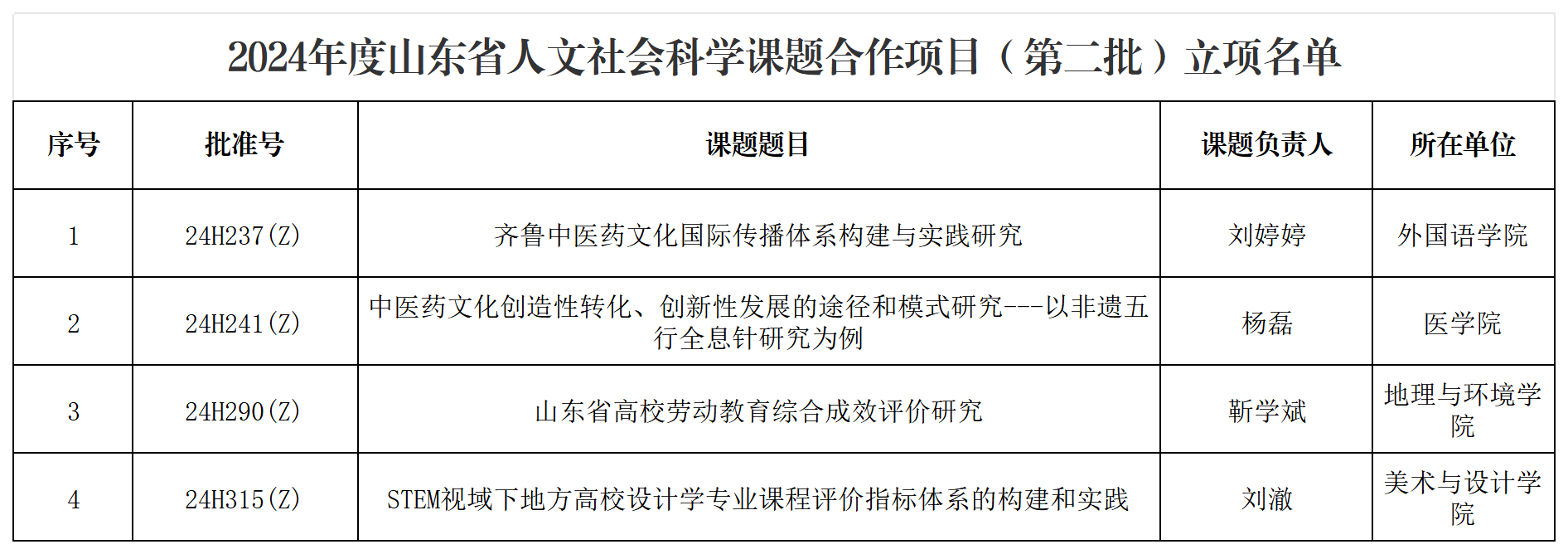 近日,山東省社科聯公布了2024年度山東省人文社會科學課題合作項目(第二批)立項名單,我校4項課題獲批資助。