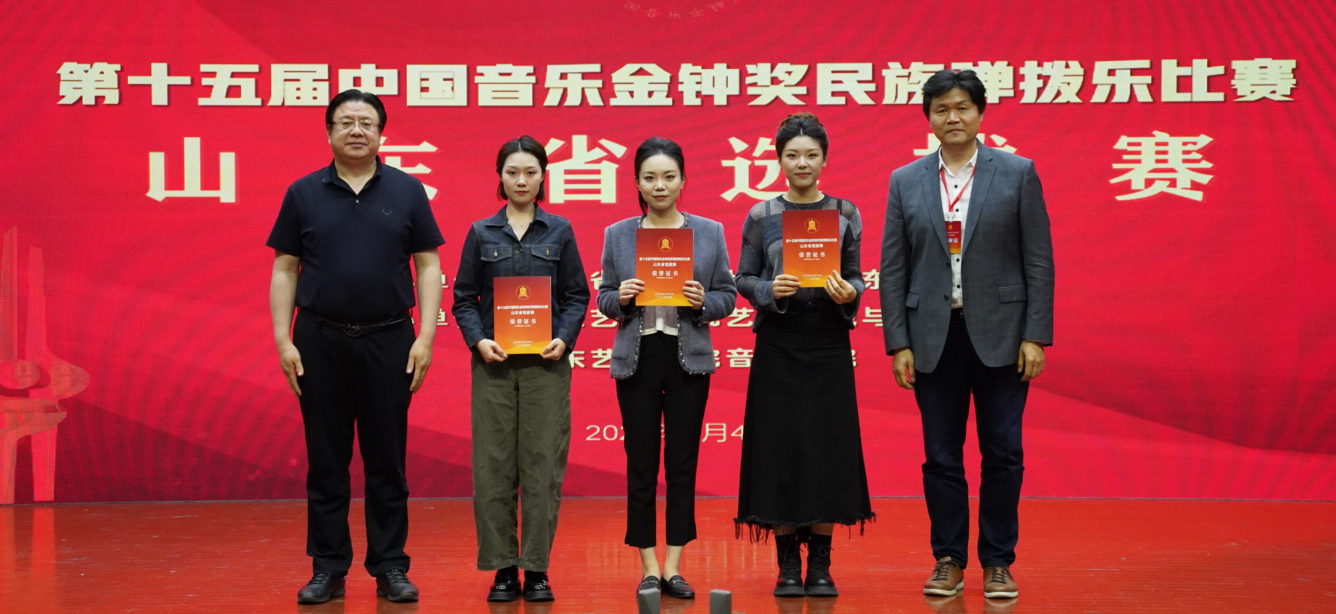 5月4日,第十五屆中國音樂金鐘獎民族彈撥樂比賽山東省選拔賽在濟南落幕,我校音樂與舞蹈學院青年教師陳姝其(下圖右二)以琵琶獨奏曲《靜默之弦》作為參賽曲目,憑借嫻熟的技藝、深情的音樂闡釋榮獲一等獎。這是我校在此賽事中的重要突破。