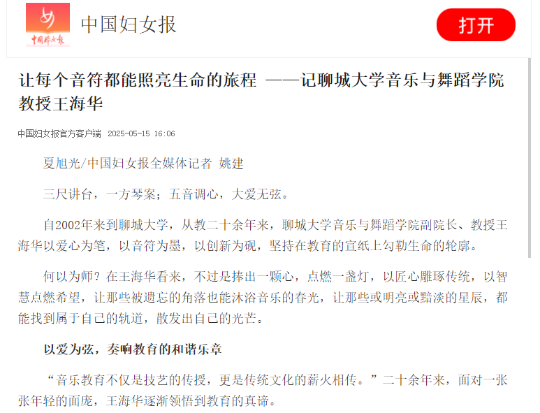 【中國婦女報官方客戶端】報道聊城大學音樂與舞蹈學院教授王海華:讓每個音符都能照亮生命的旅程