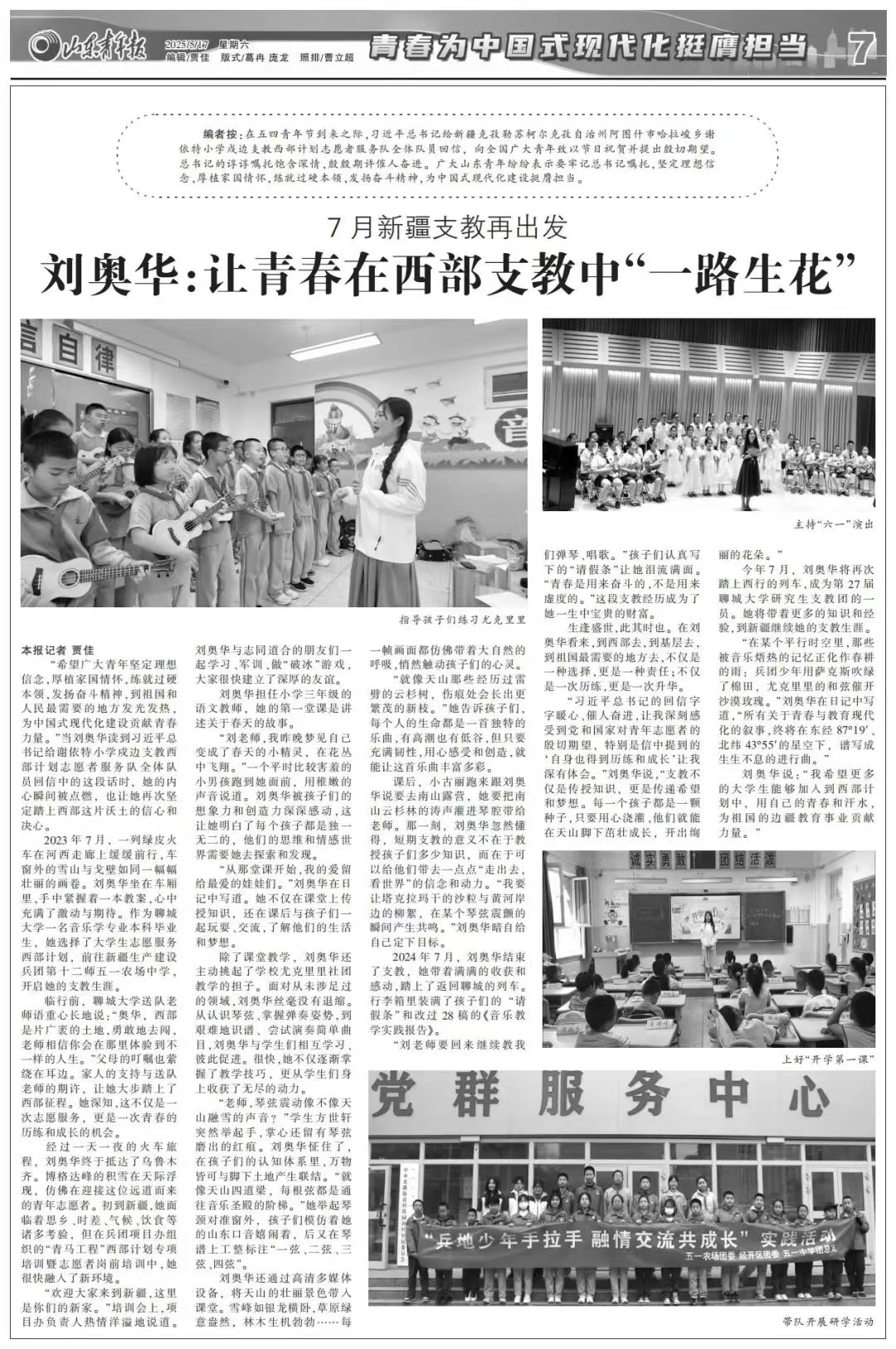 “希望廣大青年堅(jiān)定理想信念,厚植家國(guó)情懷,練就過(guò)硬本領(lǐng),發(fā)揚(yáng)奮斗精神,到祖國(guó)和人民最需要的地方發(fā)光發(fā)熱,為中國(guó)式現(xiàn)代化建設(shè)貢獻(xiàn)青春力量。”當(dāng)劉奧華讀到習(xí)近平總書記給謝依特小學(xué)戍邊支教西部計(jì)劃志愿者服務(wù)隊(duì)全體隊(duì)員回信中的這段話時(shí),她的內(nèi)心瞬間被點(diǎn)燃,也讓她再次堅(jiān)定踏上西部這片沃土的信心和決心。