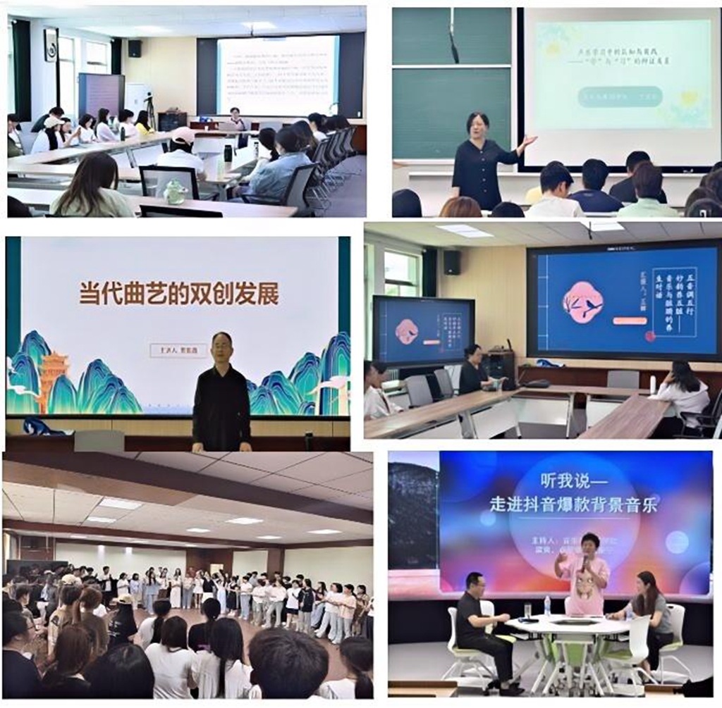 實踐周期間,系列學術講座與工作坊成為啟迪師生智慧的重要引擎。中國戲曲學院趙建新教授,從中西戲劇發生之異同、戲曲的特征及發生學原理以及戲曲在當代的傳承與發展等緯度講述戲曲藝術的源流與風采;賈振鑫副教授結合短視頻傳播案例,探討當代曲藝守正創新的雙創發展之道;王輝教授《五音調五行,妙韻養五臟——音樂與臟腑的養生對話》的主題講座深度啟發聽眾探尋音樂的價值;俞淑華副教授以“山陜民間音樂中的黃河文化與精神”為主題,回溯歷史脈絡,解碼民族音樂基因;于亞欣副教授以“場景化教學法”解析聲樂學習中的“學”與“習”,帶領學生通過肢體語言塑造歌曲意境;孫多英華老師的“奧爾夫教學法工作坊”以《兩只老虎》為樣本,通過聲勢律動與多聲部創編,示范傳統文化的現代化教學路徑;梁爽、盧愛華、楊康寧三位老師的“抖音爆款背景音樂解析”則從音樂學與傳播學雙視角,解構流行音樂的破圈邏輯,為傳統藝術傳播提供新思路。每場講座兼具學術深度與實踐指導意義,推動師生在理論思辨與案例剖析中拓寬藝術視野,在學術交流中碰撞出智慧火花。