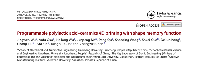 近日,聊城大學機械與汽車工程學院郭安福教授團隊在陶瓷4D增材制造研究領域取得重要進展。相關研究成果以《具有形狀記憶功能的可編程聚乳酸陶瓷4D打印》(Programmable polylactic acid–ceramics 4D printing with shape memory function)為題,發表于國際期刊《虛擬與物理樣機》(Virtual and Physical Prototyping)(中科院1區TOP,IF="10.2)。該期刊在工業和制造工程領域具有很高的學術影響力。