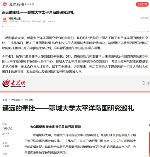 【編者按】5月29日,【大眾網】【鳳凰網】以《遙遠的牽掛——聊城大學太平洋島國研究巡禮》為題,報道了我校潛心耕耘太平洋島國研究,搭建中太友好橋梁,服務“一帶一路”倡議和國家外交的工作情況。