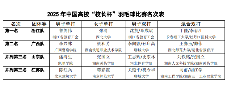 在5天中,來自全國17個省、自治區(qū)、直轄市的280余名高校精英運動員以高昂的斗志、精湛的球技和團隊合作的風采,呈現出一場場精彩的巔峰對決。承辦單位聊城大學認真兌現莊嚴承諾,贏得了中國學生體育聯合會、中國學生體育聯合會大學羽毛球分會以及社會各界的廣泛好評。圍繞混合團體、男子單打、女子單打、男子雙打及混合雙打5個項目的激烈角逐,2025年中國高校“校長杯”羽毛球比賽名次表如圖所示。