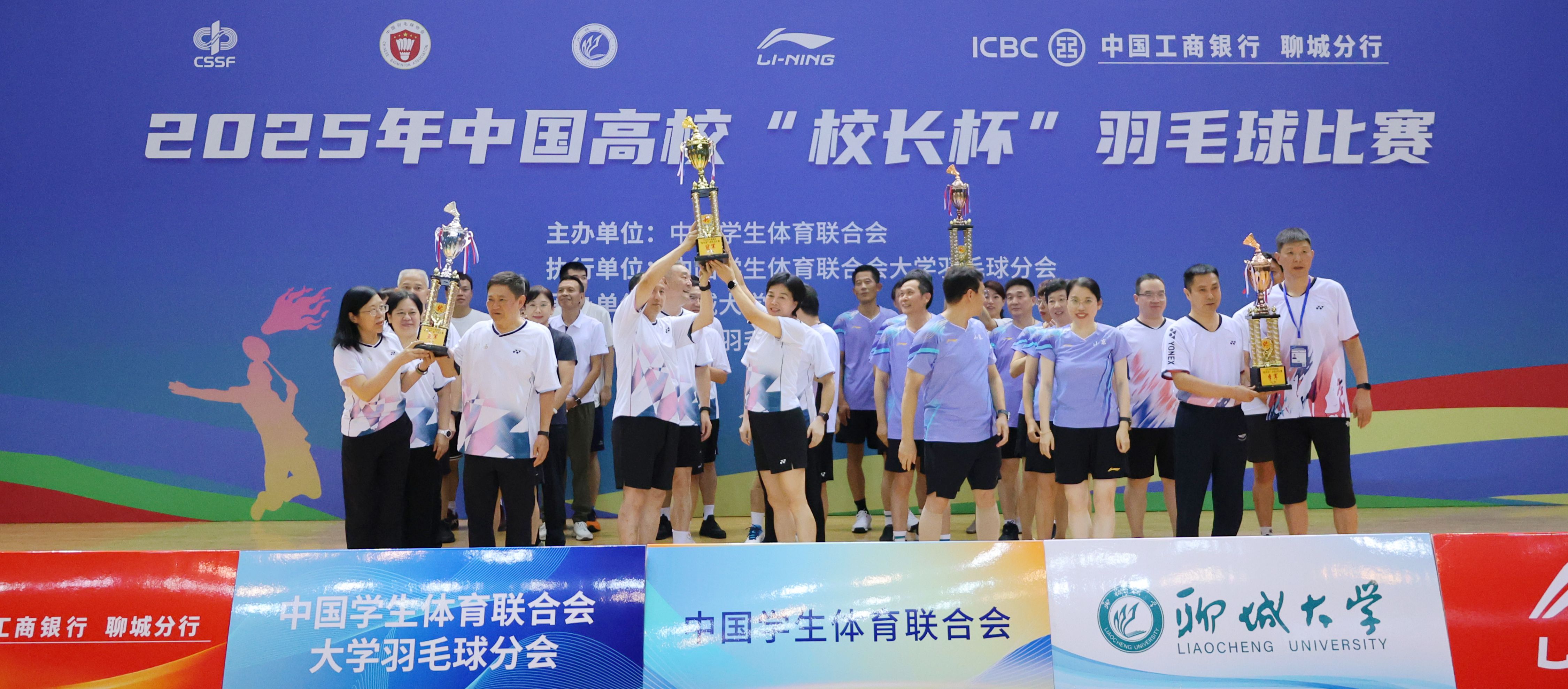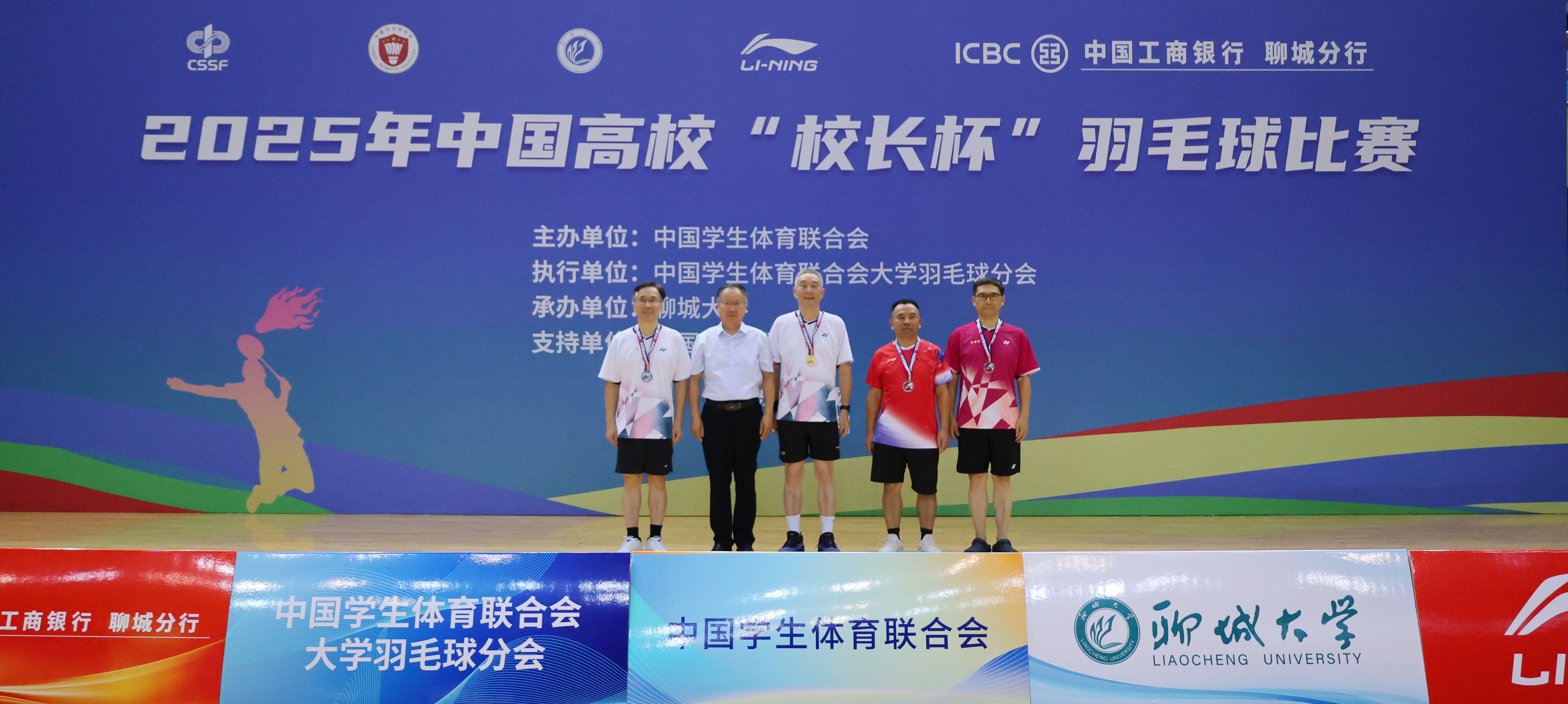 8月6日下午,2025年中國高校“校長杯”羽毛球賽在聊城體育館圓滿收官。聊城大學黨委書記關延平,黨委副書記、校長白成林,黨委副書記胡海泉出席閉幕式并為運動員頒獎。校黨委副書記房增福主持閉幕式。