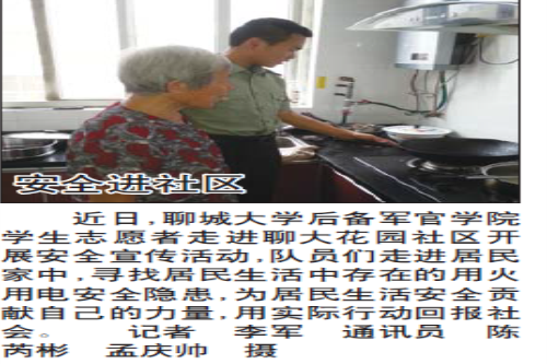 暑假期間,聊城大學后備軍官學院學生志愿者走進聊大花園社區,尋找居民生活中存在的用電安全隱患,為居民生活安全貢獻自己的力量,用實際行動回報社會。