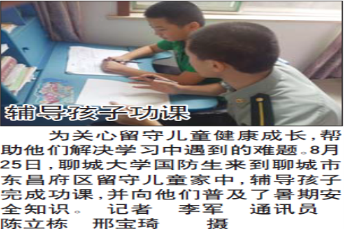 為幫助留守兒童解決學(xué)習(xí)中的困難,8月25日,聊城大學(xué)后備軍官學(xué)院國防生來到東昌府區(qū)留守兒童家中,輔導(dǎo)孩子功課,與他們共同度過快樂、安全、有意義的假期。