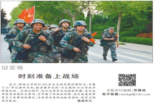 近日,聊城大學后備軍官學院組織國防生進行了30公里徒步野營拉練,磨練了國防生的堅韌品質,鍛煉了國防生的身體素質,為其將來獻身國防打下了堅實的基礎。