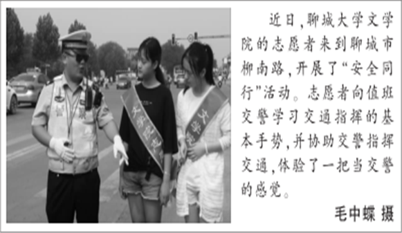 近日,聊城大學文學院志愿者于聊城市柳南路展開“安全同行”活動,向值班交警學習交通指揮的基本手勢,協助指揮交通,體驗了一把當交警的感覺。