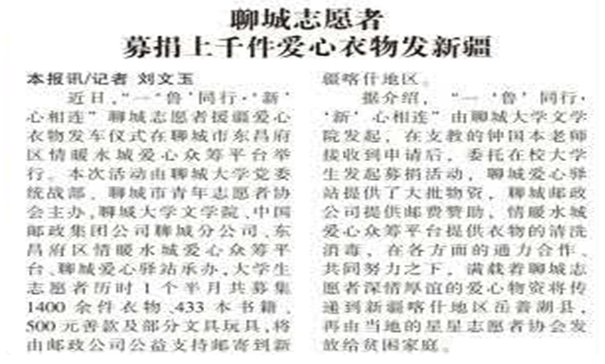 暑假到來,山東聊城大學的40位大學生志愿者卻沒有閑著,他們奔走在聊城街頭,為遠在4000多公里外喀什地區岳普湖縣的孩子們籌措衣物、書籍。11日中午,聊城大學志愿者孟春瑩在電話中說,她與同伴們正在整理衣物、書籍,準備將第一批千余件愛心物資發送到喀什地區岳普湖縣。