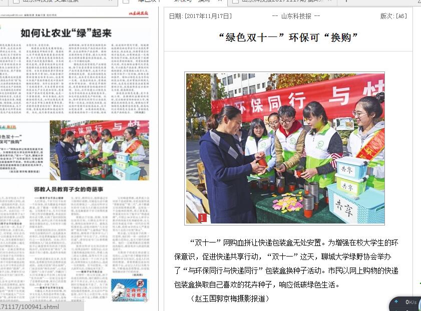 “雙十一”網購血拼讓快遞包裝盒無處安置。為增強在校大學生的環保意識,促進快遞共享行動,“雙十一”這天,聊城大學綠野協會舉辦了“與環保同行與快遞同行”包裝盒換種子活動。市民以網上購物的快遞包裝盒換取自己喜歡的花卉種子,響應低碳綠色生活。