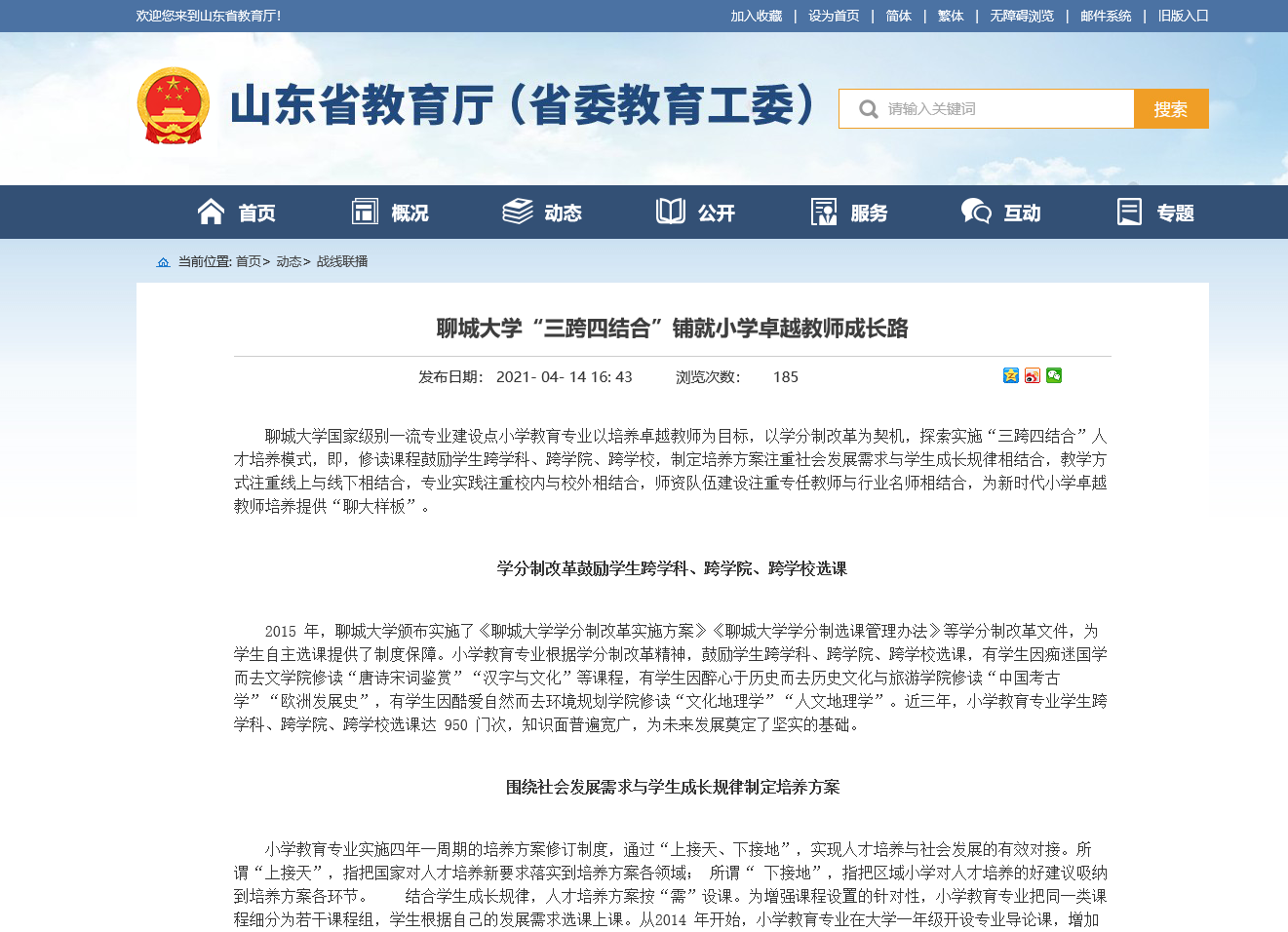 【編者按】4月14日,山東省教育廳“戰線聯播”欄目發布綜合消息《聊城大學“三跨四結合”鋪就小學卓越教師成長路 》,報道了我校教育科學學院小學教育專業人才培養模式改革的先進做法。