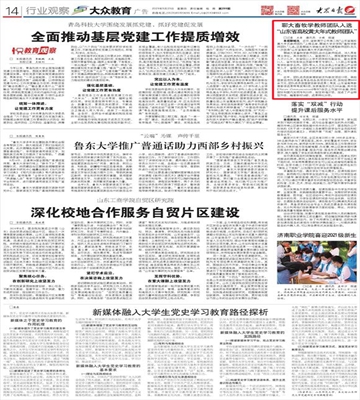 【編者按】9月23日,《大眾日報》第14版“行業觀察 大眾教育”版面以《聊大畜牧學教師團隊入選“山東省高校黃大年式教師團隊”》為題,報道了我校農學院“畜牧學教師團隊”入選“山東省高校黃大年式教師團隊”的喜訊。