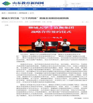 【編者按】9月18日,中國(guó)教育在線網(wǎng)站以《聊城大學(xué)打造“三個(gè)共同體”助推全省新舊動(dòng)能轉(zhuǎn)換》為題,報(bào)道了我校與浪潮集團(tuán)簽約共建“聊城大學(xué)浪潮信息技術(shù)學(xué)院”“聊城大學(xué)浪潮碳中和實(shí)驗(yàn)室創(chuàng)新中心”“聊城大學(xué)浪潮產(chǎn)教融合實(shí)訓(xùn)基地”,攜手打造緊密型共享型的人才培養(yǎng)共同體、協(xié)同創(chuàng)新共同體和科技成果轉(zhuǎn)化共同體,服務(wù)山東產(chǎn)業(yè)轉(zhuǎn)型升級(jí)和新舊動(dòng)能轉(zhuǎn)換的做法。9月20日,山東教育新聞網(wǎng)也報(bào)道了該消息。