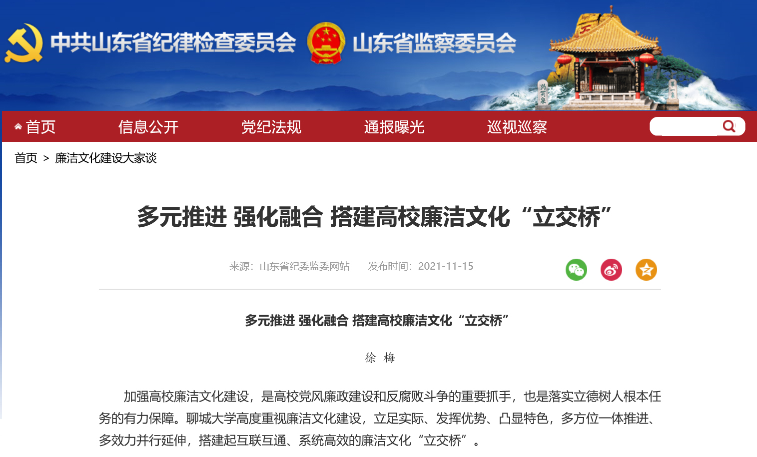 11月15日,山東省紀(jì)委監(jiān)委網(wǎng)站刊發(fā)我校黨委常委、紀(jì)委書記、省監(jiān)委駐校監(jiān)察專員徐梅題為《多元推進(jìn),強(qiáng)化融合,搭建高校廉潔文化“立交橋”》的署名文章。文章系統(tǒng)總結(jié)了我校廉潔文化建設(shè)的實(shí)踐經(jīng)驗(yàn),從理論上進(jìn)行了歸納和闡述,指出加強(qiáng)高校廉潔文化建設(shè)是高校黨風(fēng)廉政建設(shè)和反腐敗斗爭(zhēng)的重要抓手,也是落實(shí)立德樹人根本任務(wù)的有力保障,必須立足實(shí)際、發(fā)揮優(yōu)勢(shì)、凸顯特色,多方位一體推進(jìn)、多效力并行延伸,搭建起互聯(lián)互通、系統(tǒng)高效的廉潔文化“立交橋”。