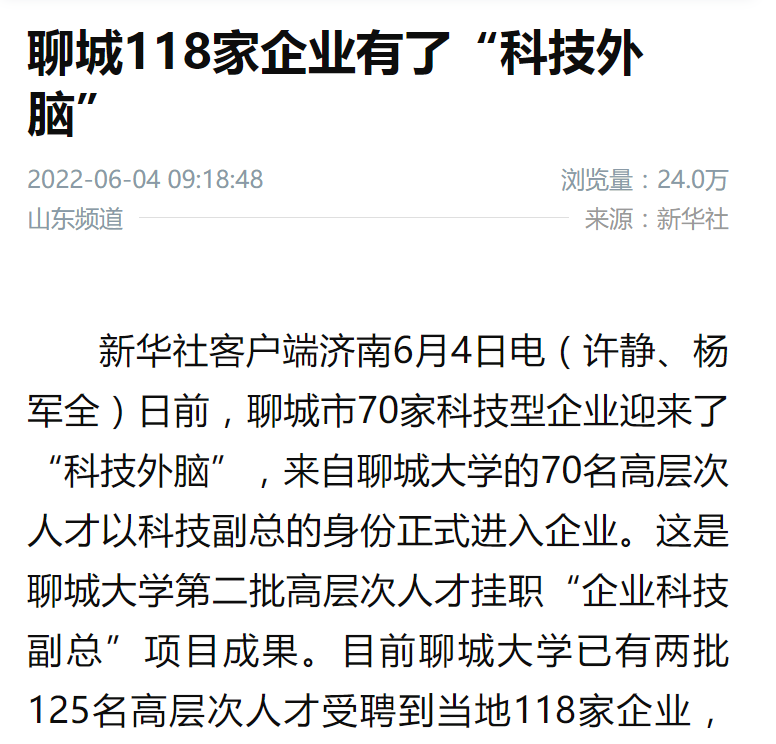 【編者按】6月4日,新華社客戶端以《聊城118家企業有了“科技外腦”》為題報道了我校125名高層次人才掛職聊城市企業科技副的消息。此外,中國教育新聞網、中國科技網、中國教育在線也報道了該消息。