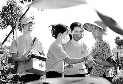 2022年7月1日,在湖南省邵陽市隆回縣桃花坪街道小水塘村,南華大學2022年暑期三下鄉社會實踐服務團的志愿者走進田間地頭給村民送醫送藥。曹正平攝/光明圖片