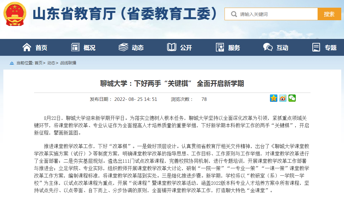 【編者按】8月25日,山東省教育廳“戰線聯播”欄目刊發了題為《聊城大學:下好兩手“關鍵棋” 全面開啟新學期》的消息,報道了我校在新學期將課堂教學改革、專業認證作為全面提高人才培養質量重要舉措的典型經驗和先進做法。