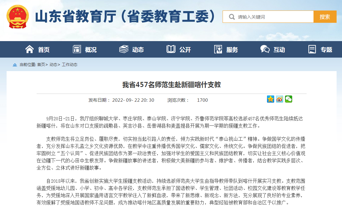 【編者按】9月22日,山東省教育廳工作動態欄目以《我省457名師范生赴新疆喀什支教》為題,報道了在省廳組織下,聊城大學與棗莊學院、泰山學院、濟寧學院、齊魯師范學院等高校選派457名優秀師范生陸續抵達新疆喀什,將在山東對口支援的疏勒縣、英吉沙縣、岳普湖縣和麥蓋提縣開展為期一學期的援疆支教工作的情況。海報新聞 、今日頭條以《 踐行志愿精神!聊城大學60名優秀本科師范生奔赴新疆喀什支教》,齊魯壹點、大眾網以《聊城大學援疆實習支教大學生再出發》為題報道了聊城大學第二批援疆實習支教學子出征的消息。