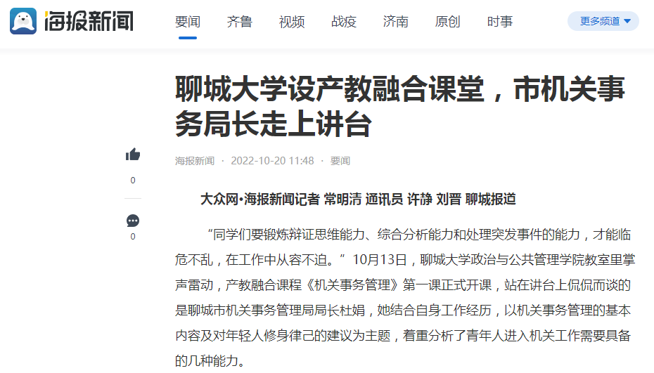 【編者按】10月20日,海報新聞客戶端以《聊城大學(xué)設(shè)產(chǎn)教融合課堂,市機(jī)關(guān)事務(wù)局長走上講臺》為題報道了我校政治與公共管理學(xué)院政管學(xué)院依托聊城大學(xué)機(jī)關(guān)事務(wù)研究中心開設(shè)《機(jī)關(guān)事務(wù)管理》課程,推進(jìn)產(chǎn)教融合走深走實(shí)的先進(jìn)做法。
