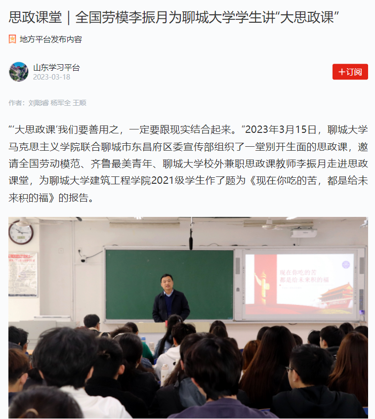 【編者按】3月18日,學(xué)習(xí)強(qiáng)國(guó)山東學(xué)習(xí)平臺(tái)以《思政課堂|全國(guó)勞模李振月為聊城大學(xué)學(xué)生講“大思政課”》為題,報(bào)道我校思政課課堂教學(xué)改革創(chuàng)新的做法。