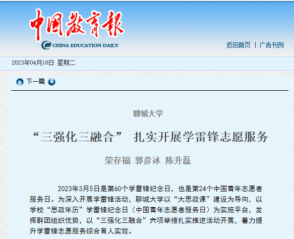 【編者按】4月18日,中國教育報以《聊城大學 “三強化三融合” 扎實開展學雷鋒志愿服務》為題,報道我校以“大思政課”建設為導向,以學校“思政年歷”學雷鋒紀念日(中國青年志愿者服務日)為實施平臺,發(fā)揮群團組織優(yōu)勢,以“三強化三融合”六項舉措扎實推進活動開展,著力提升學雷鋒志愿服務綜合育人實效情況。