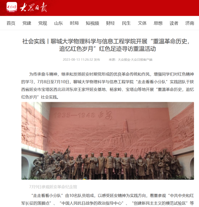 【編者按】8月13日,《大眾日報》客戶端報道了物理科學與信息工程學院實踐團隊于陜西省延安市寶塔區西北沿河東岸王家坪延安基地、楊家嶺、寶塔山等地開展的“重溫革命歷史,追憶紅色歲月”社會實踐活動。