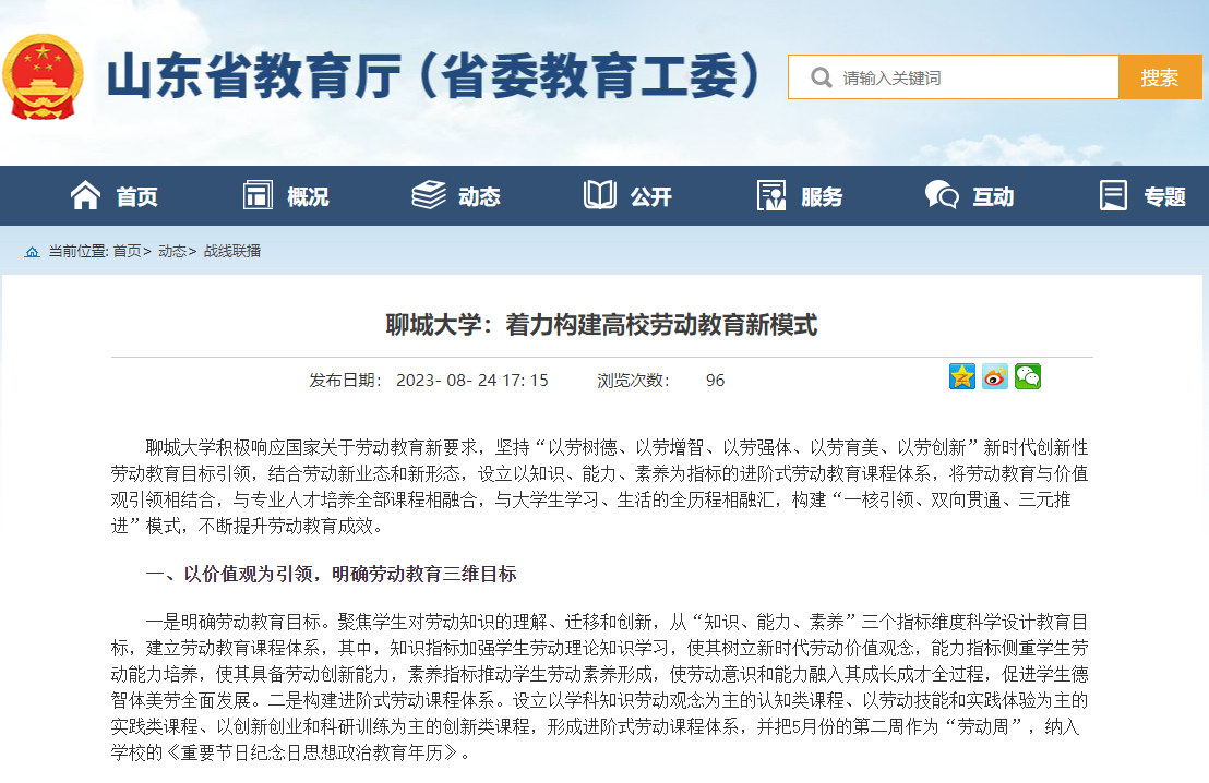 【編者按】8月24日,山東省教育廳(省委教育工委)以《聊城大學:著力構建高校勞動教育新模式》為題報道我校積極響應國家關于勞動教育新要求,創新高校勞動教育新模式,多措并舉開展高校勞動教育教學實踐的經驗做法,展現了我校推行“一核引領、雙向貫通、三元推進”模式,不斷提升勞動教育成效。