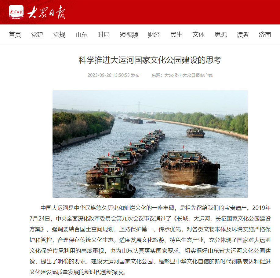 【編者按】2023年9月26日,大眾日報客戶端以《科學推進大運河國家文化公園建設的思考》為題報道了我校在大運河研究方面的積極探索。