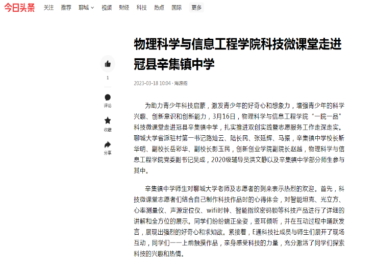 【今日頭條】報(bào)道物理科學(xué)與信息工程學(xué)院科技微課堂走進(jìn)冠縣辛集鎮(zhèn)中學(xué)