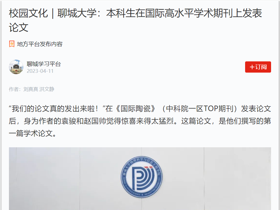 【編者按】4月11日,學習強國(聊城學習平臺)以《聊城大學:本科生在高水平學術期刊上發表論文》為題報道了物理科學與信息工程學院光電信息科學與工程專業袁駿、趙國帥中科院一區TOP期刊《Ceramics International》(《國際陶瓷》)發表論文,體現我校本科培養成果顯著,科研水平和能力顯著提高。