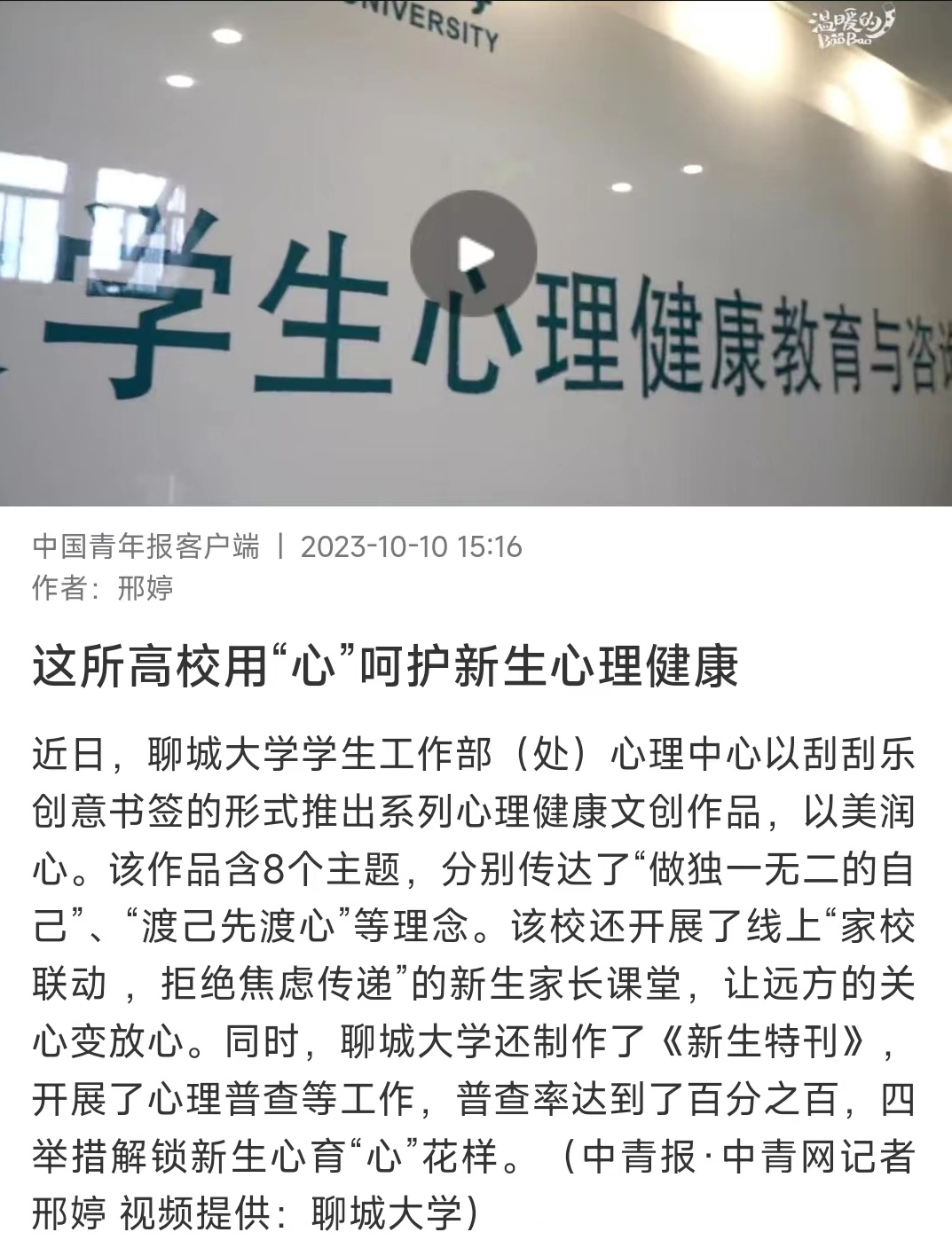 【編者按】 2023年10月10日,中國青年報(bào)客戶端以《這所高校用“心”呵護(hù)新生心理健康》為題,報(bào)道了聊城大學(xué)通過推出系列文創(chuàng)作品、開設(shè)新生家長課堂、開展心理普查等活動(dòng),富有創(chuàng)意地開展新生心理健康教育。