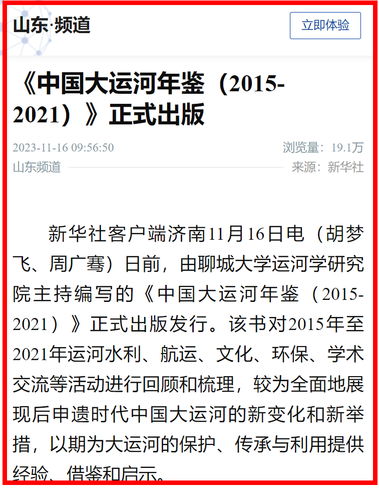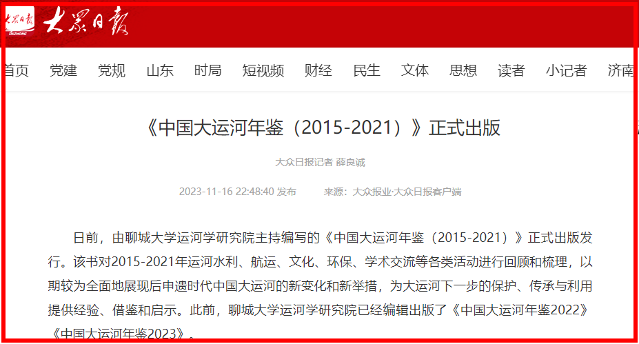 【編者按】11月16日,【新華社客戶端】【大眾日報】以《《中國大運(yùn)河年鑒(2015-2021)》正式出版》為題,報道聊城大學(xué)運(yùn)河學(xué)研究院主持編寫的學(xué)術(shù)著作正式出版發(fā)行。