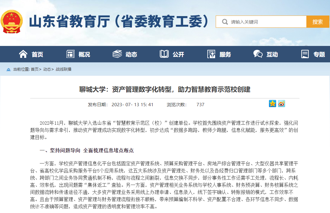 【山東省教育廳(省委教育工委)】報道:聊城大學:資產管理數字化轉型,助力智慧教育示范校創建